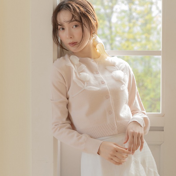 柔らかいニットにフラワーモチーフを添えた、甘さのある表情のカーディガン。