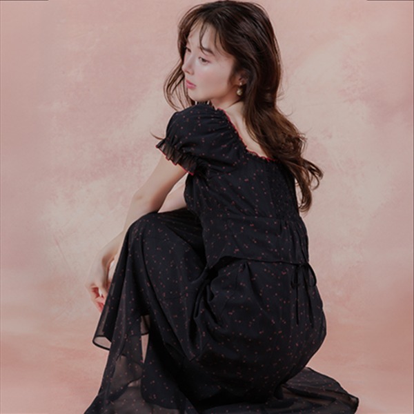 オリジナルのチェリー柄をのせた軽やかなシフォンが、甘さと上品さをほどよく引き立てるワンピース。