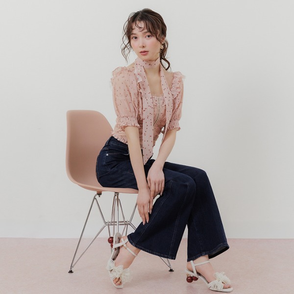 オリジナルのチェリー柄にチュールを重ね、甘さと軽やかさを引き立てた華やかなブラウス。