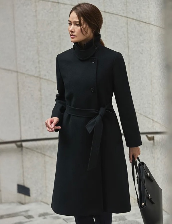 凛とした大人の女性らしさを引き立てる、 黒のベルテッドコート