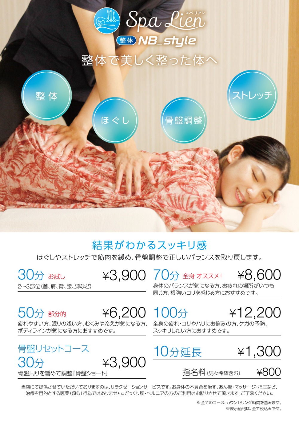 | 注意事項 | 下記に該当する方は施術をお断りしています。 1.妊娠中の方 ※リフレクソロジーのみ一部例外あり。詳しくはお問合せください 2.手術後1カ月以内の方 3.骨粗鬆症の方 4.発熱・泥酔されている方 5.24時間以内にワクチン接種を受けた方 6.ヘルニア治療中の方 7.骨折されている方※ひびも含む 8.水虫の方 9.同伴者に小学生以下の方がいる場合 【対象年齢】 ボディケア・・・小学生以上 リフレクソロジー・・・中学生以上 整体NB_style・・・15歳以上 ご不明な点は、お電話でお問い合わせください。 |