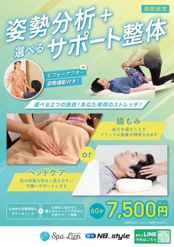 お身体に合わせた整体+腸もみ又はヘッドケア