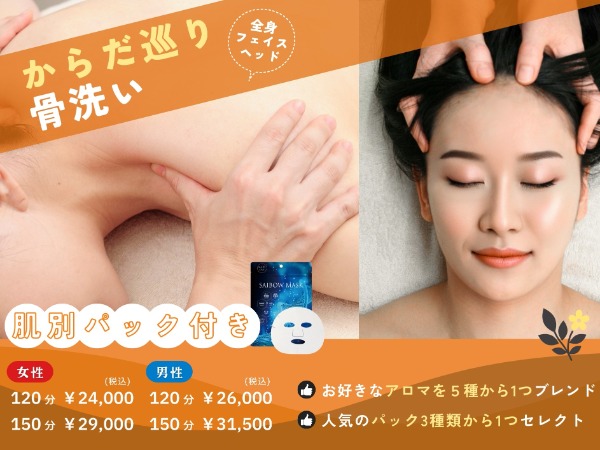 《タマヌオイルを贅沢に使用したオリジナルオイル+選べるアロマオイル》で贅沢に全身+フェイス+ヘッドを「骨洗い」するコース